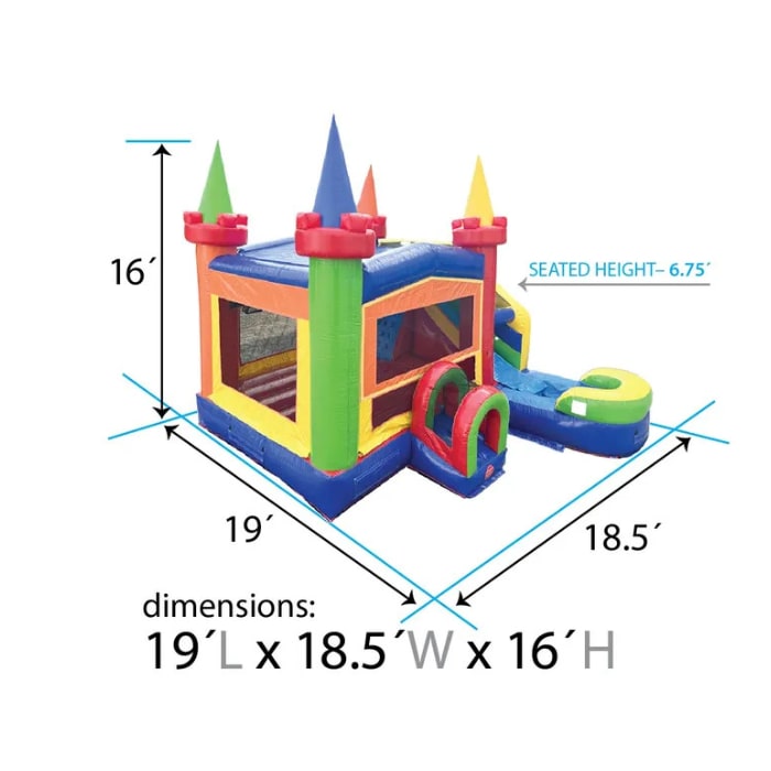 ColorCraze Castle matches the slide height and bounce area of our standard combos. Safety is built in with secure anchor points, netted sides, and sturdy material. Always follow setup and supervision guidelines for safe play. 🧯