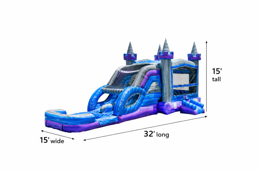 Turn your next party into a winter wonderland with our Frozen Castle Combo from The Big Bounce! This stunning blue and purple castle-themed inflatable features a spacious bounce area, a climbing wall, and dual-lane slides that end in a 12–16 inch deep splash pool for extra fun.